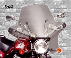 Brand new Slip Streamer S-02 Spirit Clear Windshield 3/16 Lucite Acrylic DOT and ANSI approved. Advanced design, sporty graphics and definitive lines. Longer lowers give added protection against weather and road hazards. A special designed cushioned seal headlight cutout allows the Enterprise to fit both a round and square headlight. A strong four-point fully adjustable anodized aluminum ball and socket mounting system and two-piece lower fork-tube clamp provide mind-easing stability. Dimensions: 21 1/2" H x 35" W x 19" B